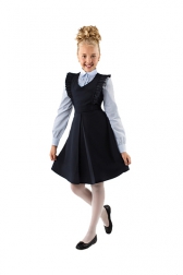 Стильный школьный сарафан в темно-синего цвета. Практичный и удобный. Дополнен рюшами и поясом, с помощью которого можно регулировать ширину изделия. Сзади застегиваются на молнию. Состав: Шерсть 20% Вискоза 40% ПЭ 40%