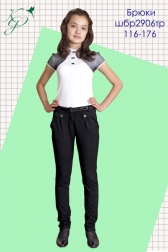 Трикотажные облегающие брюки, к низу зауженные. У входа во внутренние карманы крепятся клапаны с пуговицей. В шлевках продернут ремешок; застежка впереди на молнию.