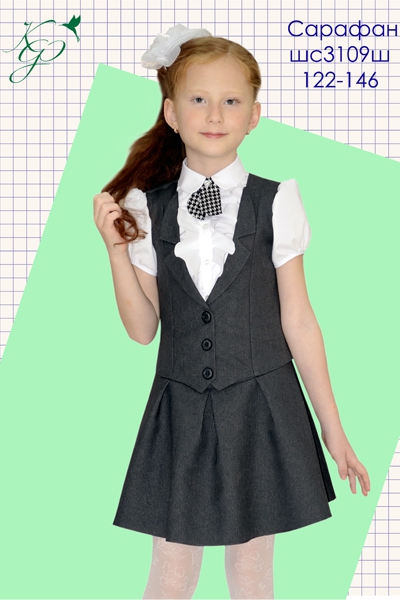 Сарафан из костюмной ткани для младшей школьной группы, полуприталенного силуэта с заниженной линией талии. Выполнен с имитацией жакета с юбкой. По полочке декоративные лацканы, застежка центральная, на пуговицы. Юбка сарафана со складами.