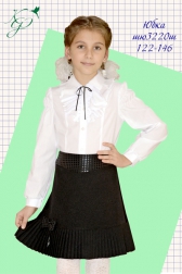 Юбка на круговой подкройной кокетке, слегка расклешенная, по низу оформлена воланом – плиссе. Украшением служит небольшой бант и использование отделочной ткани. Застежка в среднем шве спинки на молнию. По талии юбка сзади стянута частично на эластичную тесьму.