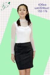Юбка для старшей школьной возрастной группы укороченной длины, ассиметричного кроя. Линия талии ниже на 2 см, на обтачке. Верхняя часть переда с отрезной ассиметричной кокеткой, переходящей в пату, которая закреплена пуговицей. Нижняя часть переда — с отрезными деталями. Застежка в шве, спинки, по низу – небольшая шлица.
